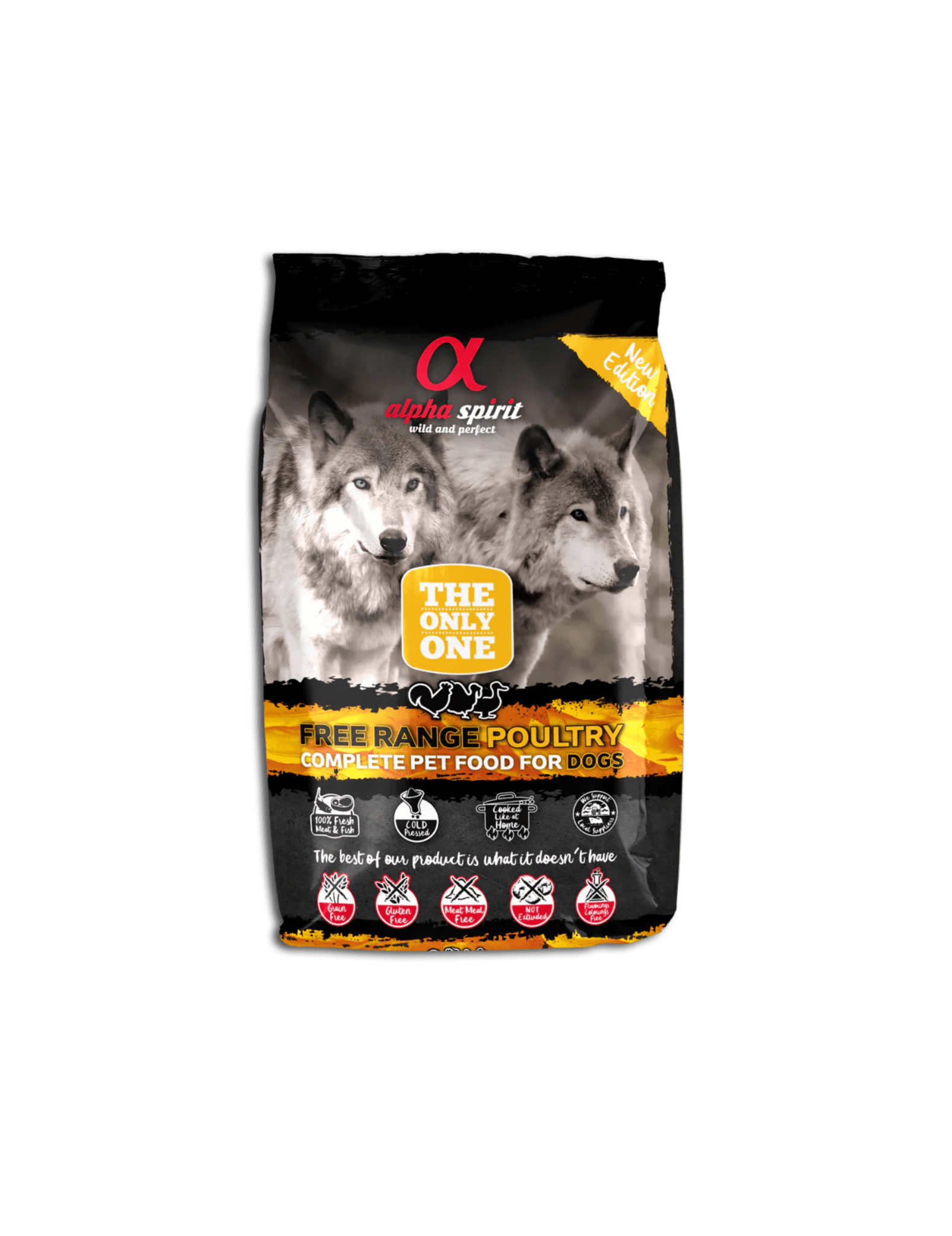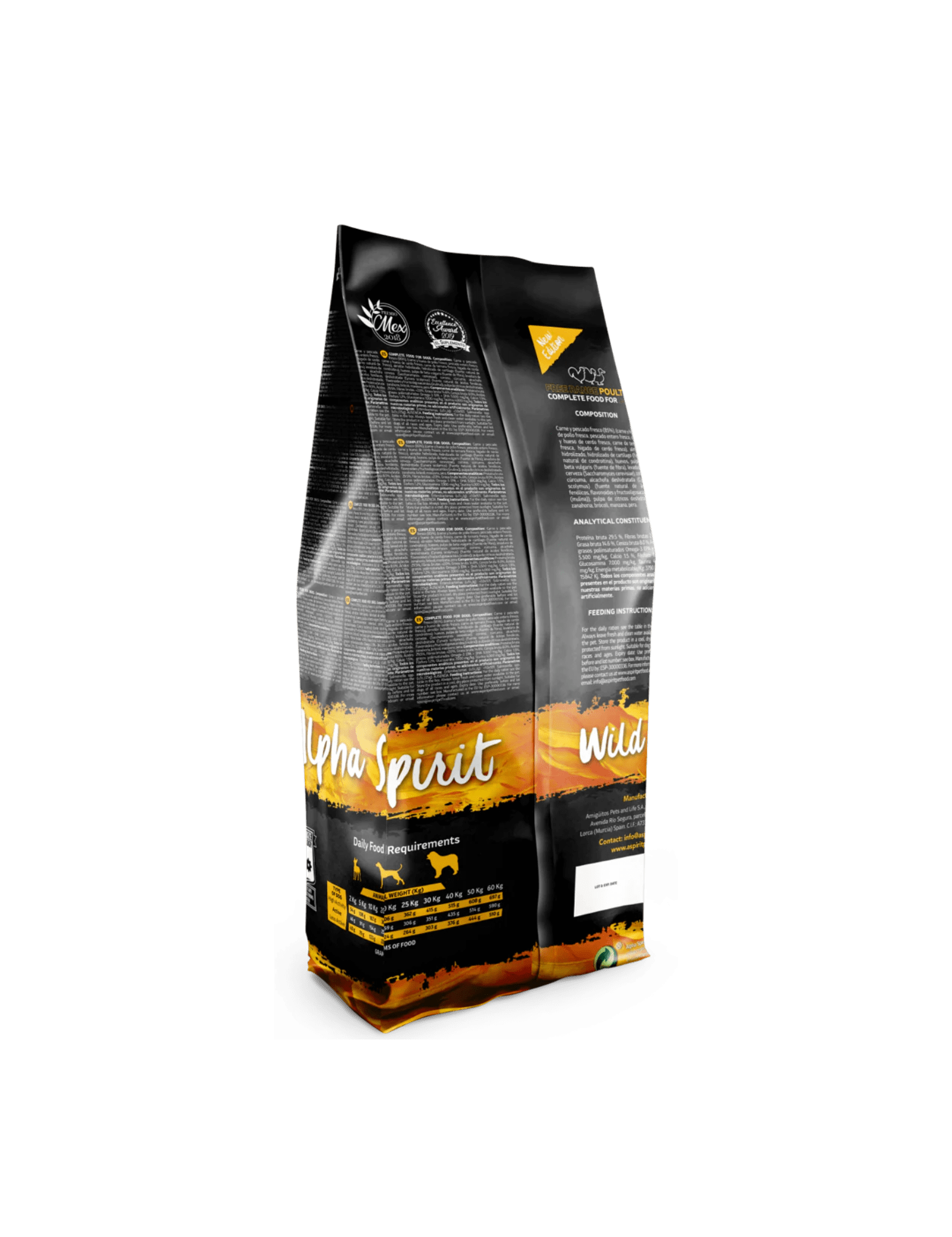 35% carne de pollo fresca, 25% carne de pavo fresca, 20% carne de pato fresca, 10% pescado entero fresco (alacha (Sardinella aurita), caballa (Scomber scombrus), jurel (Trachurus spp.), sardina (Sardina pilchardus)), almidón hidrolizado, huevos, pulpa de Beta Vulgaris, levadura de cerveza (Saccharomyces cerevisiae), zanahoria, manzana, achicoria, comino (Cuminum cyminum), romero (Rosmarinus officinalis), cúrcuma (Curcuma longa)