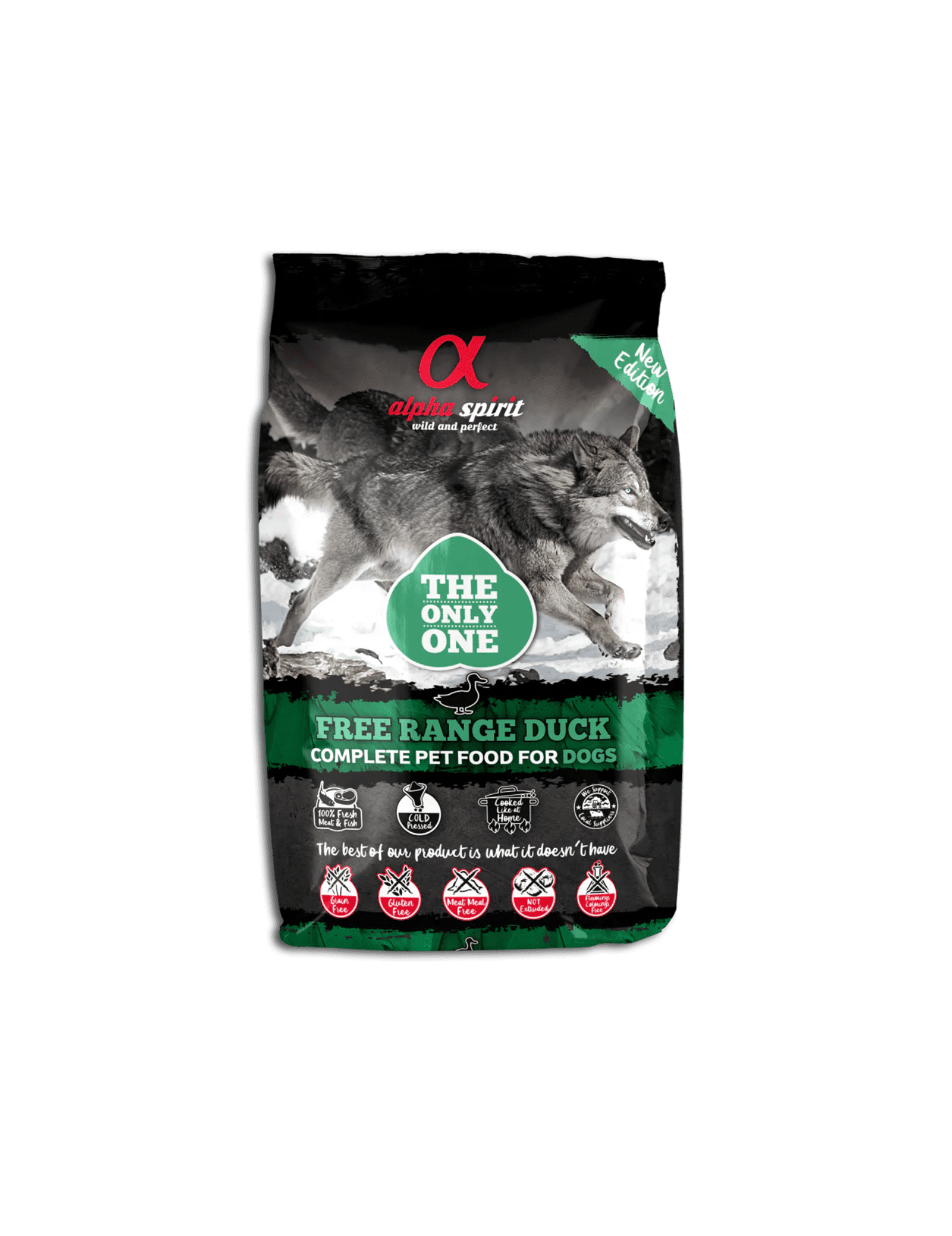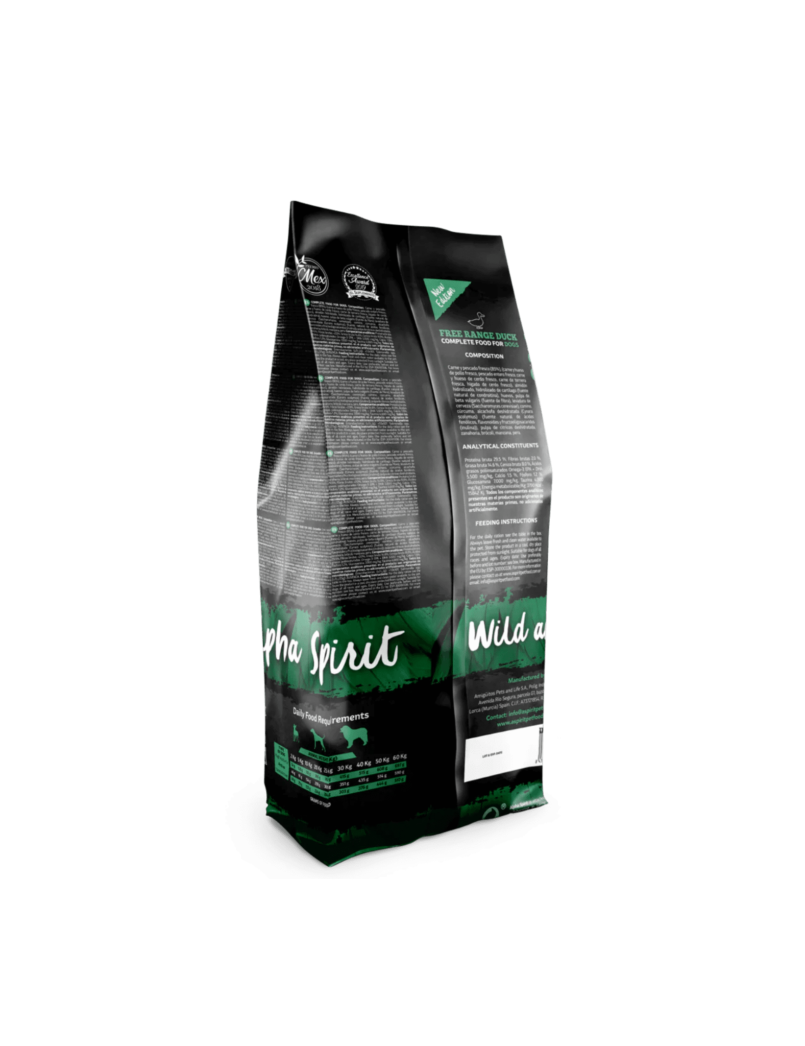 45% carne de pato fresca, 20% carne de pollo fresca, 20% pescado entero fresco (alacha (Sardinella aurita), caballa (Scomber scombrus), jurel (Trachurus spp.), sardina (Sardina pilchardus)), almidón hidrolizado, huevos, pulpa de Beta Vulgaris, levadura de cerveza (Saccharomyces cerevisiae), pera, piña, achicoria, plátano, comino (Cuminum cyminum), orégano (Origanum vulgare) anís (Pimpinella anisum), cúrcuma (Curcuma longa), hinojo (Foeniculum vulgare)