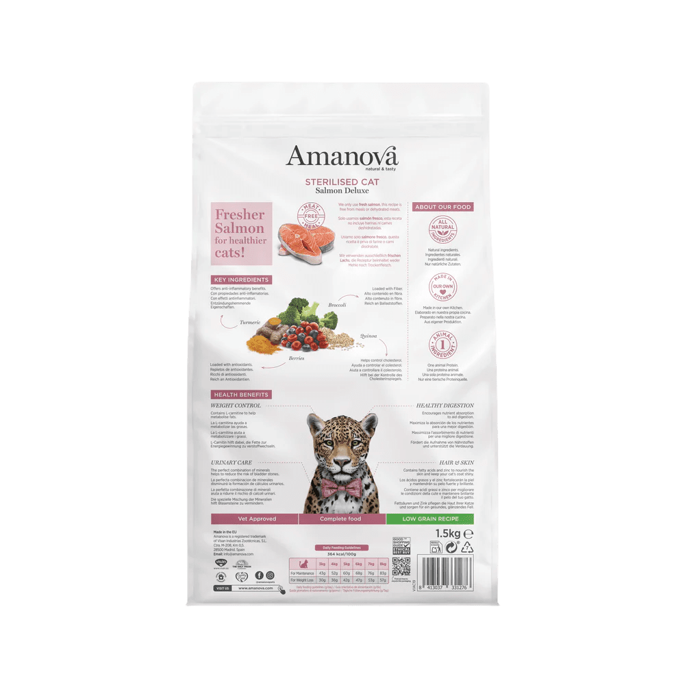 Salmón preparado en fresco 55% (usamos 85 kg de salmón preparado en fresco para producir 100 kg de nuestro producto), guisantes verdes enteros, proteína de patata, proteína de arroz, fibra de manzana, levaduras (Saccharomyces cerevisiae), hidrolizado de pescado, minerales, ligno celulosa, proteína de guisantes, arroz integral, tapioca, psyllium, malta de cebada en polvo, calabaza deshidratada, kale deshidratada, krill del antártico, alga kelp, spirulina, pared celular hidrolizada de levaduras (fuente de MOS) 1000 mg/kg, achicoria(fuente de FOS) 1000 mg/kg, quínoa 1000 mg/kg, brócoli deshidratado 1000 mg/kg, arándanos azules 1000 mg/kg, arándanos rojos 1000 mg/kg, jengibre, pulpa de cítricos, cúrcuma 500 mg/kg, romero, yucca schidigera.