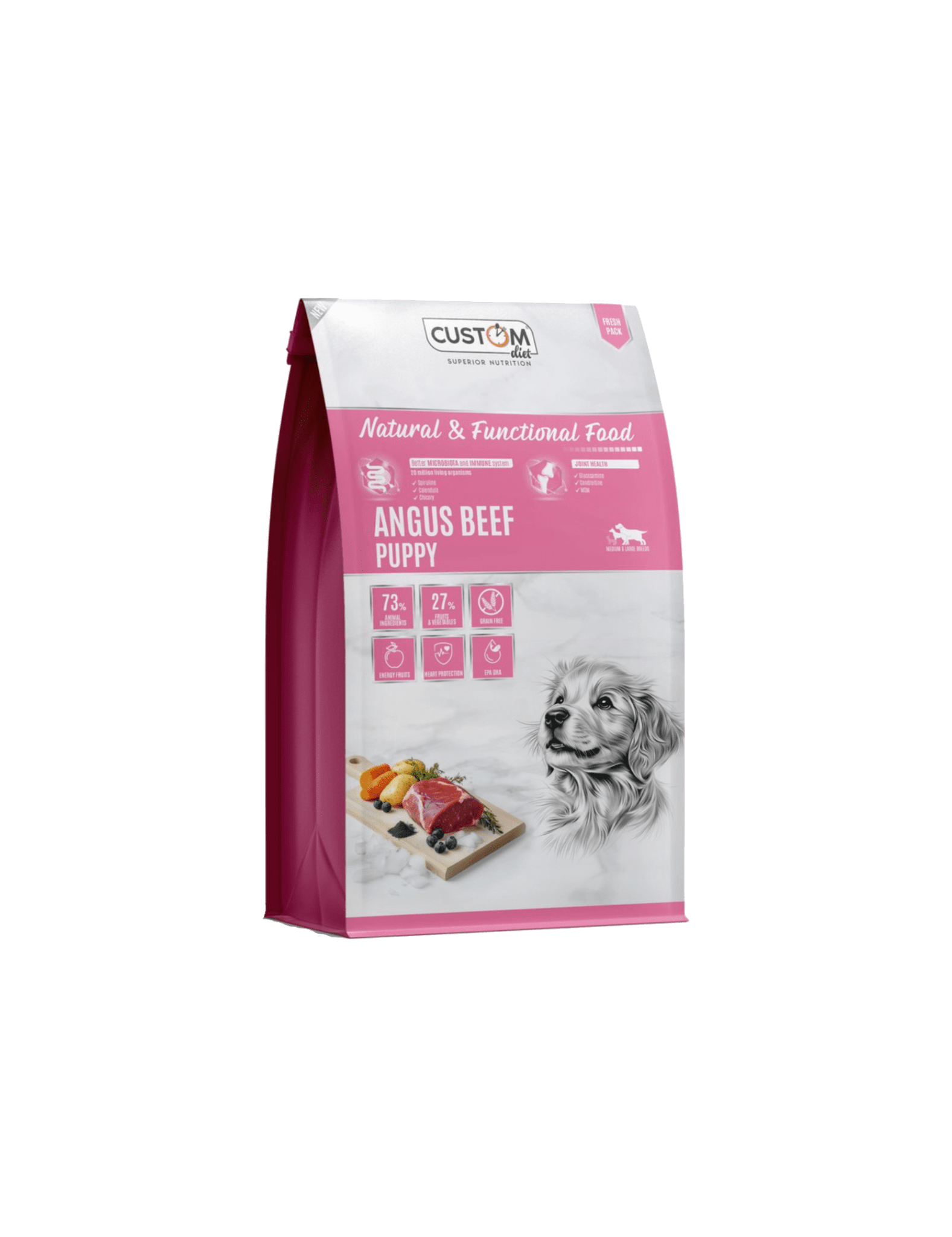 Composición:Ternera deshidratada (28%), salmón deshidratado (16%), pollo deshidratado (12%), salsa de Angus (10%), patata (9%), boniato (7%), aceite de salmón (7%), guisantes enteros (5%), manzana (2%), zanahoria (2%), naranja, limón, pomelo, achicoria, romero, glucosamina (1520 mg/kg), condroitina (1150 mg/kg), taurina (1400 mg/kg), probióticos (20 millones de microorganismos vivos/kg). EM=4415Kcal/kg
