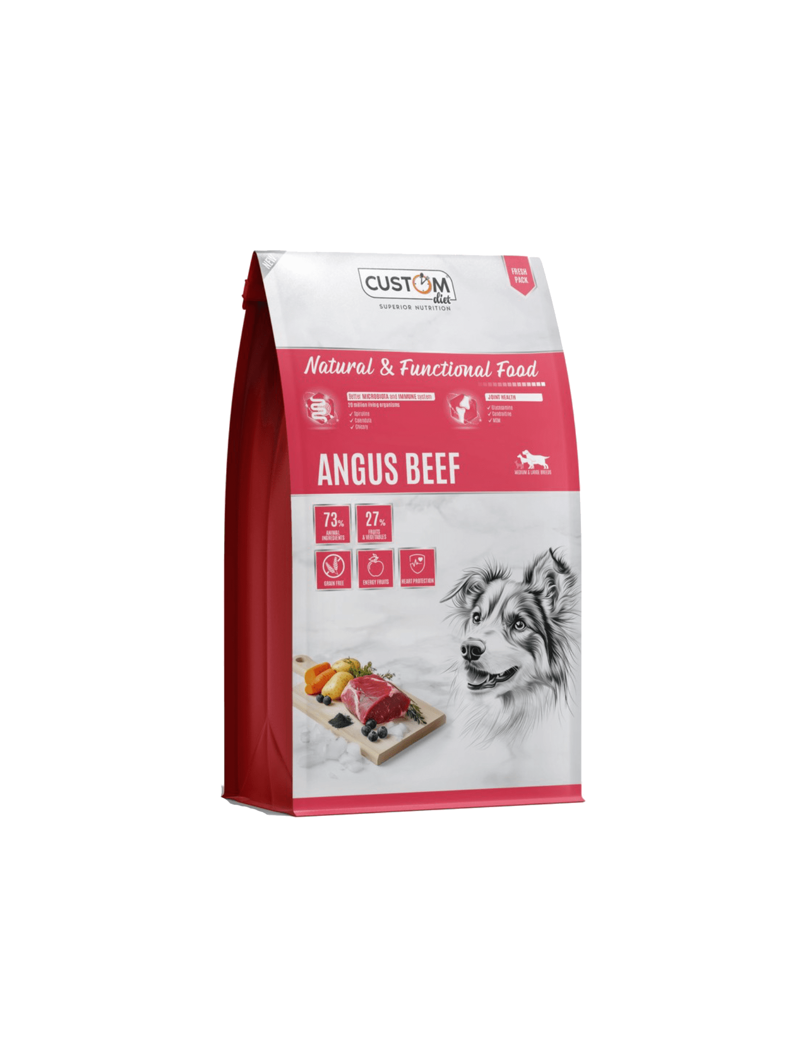 Composición:Ternera deshidratada (44%), pollo fresco (12%), salsa de Angus (10%), patata (9%), boniato (7%), aceite de salmón (7%), guisantes enteros (5%), manzana (2%), zanahoria (2%), naranja, limón, pomelo, achicoria, romero, glucosamina (1520 mg/kg), condroitina (1150 mg/kg), taurina (1100 mg/kg), probióticos (20 millones de microorganismos vivos/kg). EM=4375Kcal/kg