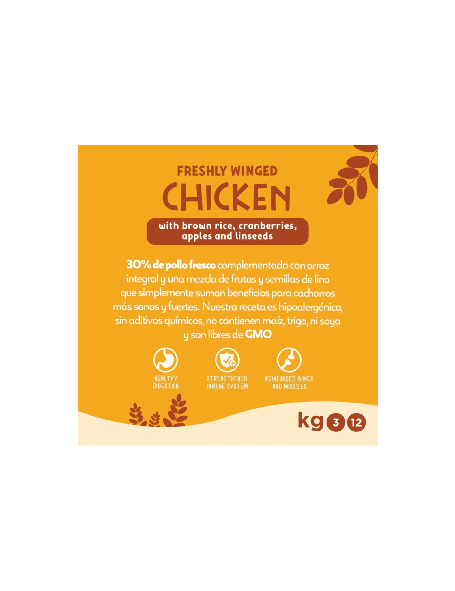 Elaborado con salmón 53% (salmón fresco 30%, proteína deshidratada de salmón 20%, hidrolizado de salmón 3%), arroz integral 3%, pulpa de remolacha 1%, aceite de pescado 0,1%, inulina(FOS) 0,1%, pared celular hidrolizada levaduras (fuente de MOS) 0,1%, arándanos 30 mg/kg, manzana 30 mg/kg, ciruela 30 mg/kg, cítricos 30 mg/kg, jengibre 0.01% y extracto de caléndula (fuente de luteína) 0.01%.