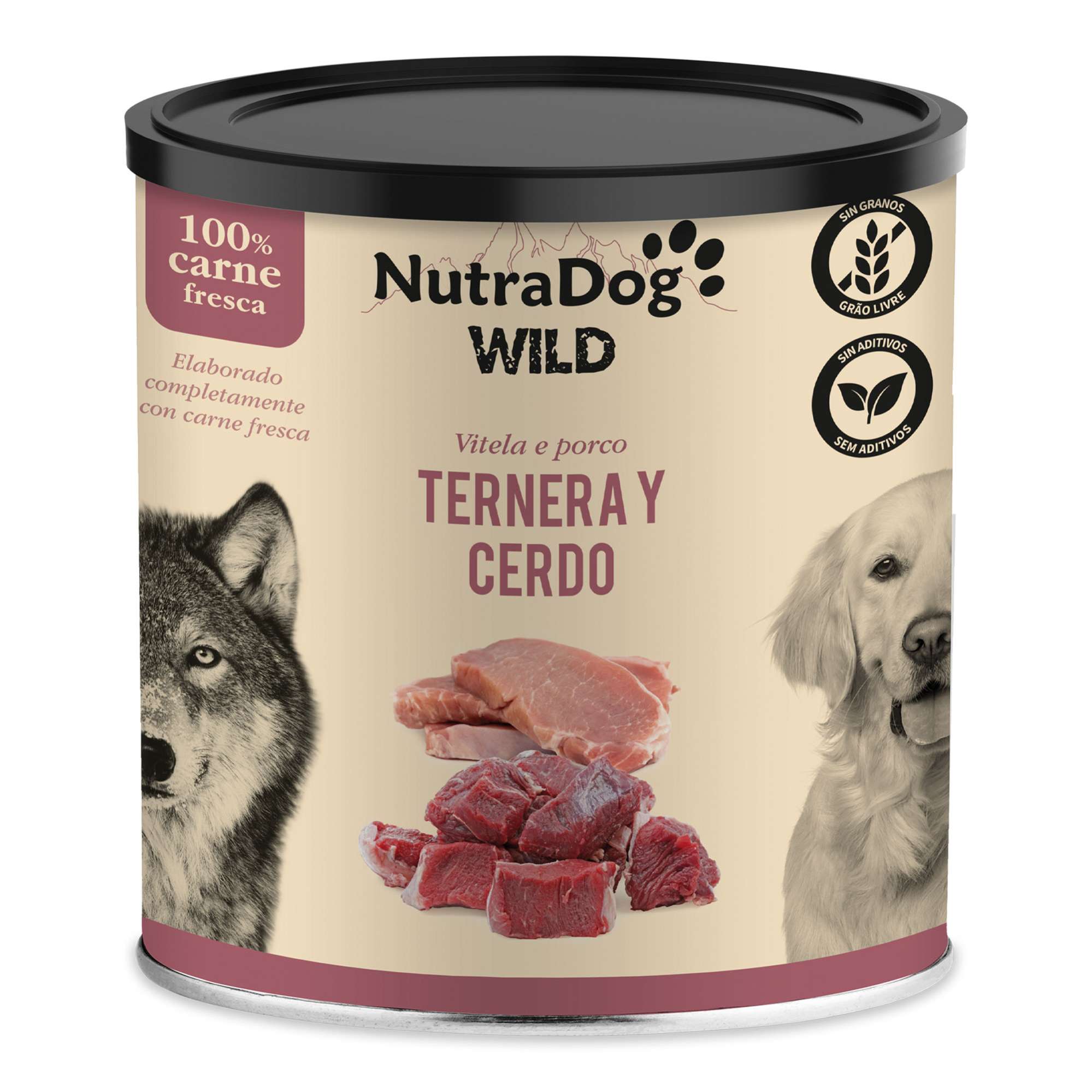 Alimento húmedo de NutraDog WILD para perros 100% natural, elaborado únicamente con ternera y cerdo. Los perros son animales carnívoros y necesitan una dieta rica en carne y grasas de calidad para satisfacer sus necesidades proteicas. Este alimento es una mezcla ideal de ternera y cerdo, sin aditivos ni ningún otro ingrediente.