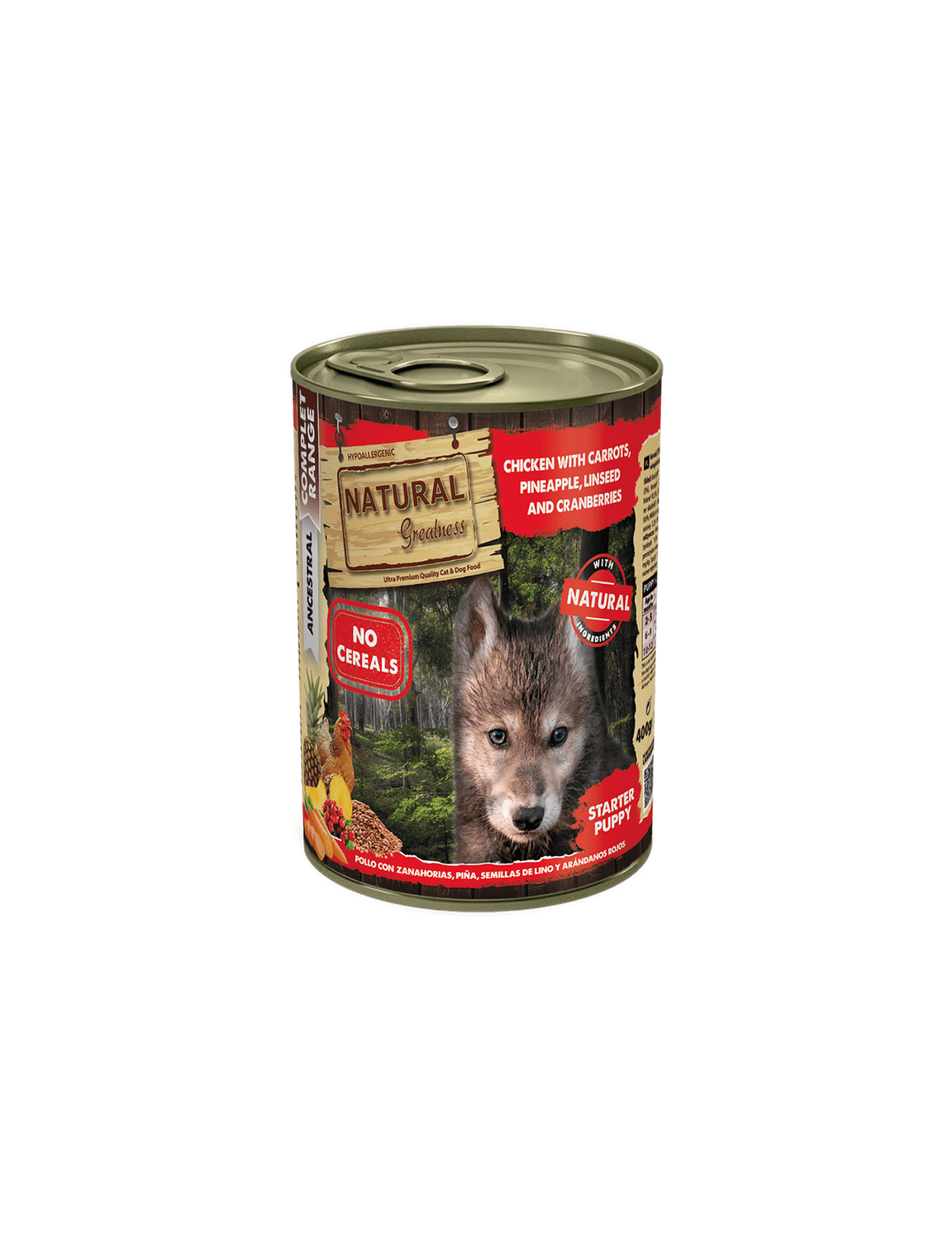 Composición: Carne de Pollo (55%), Zanahoria (4%), Aceite de girasol (3%), Piña (5% a partir de deshidratada), Sustancias minerales, Semillas de lino (0,5%), Arándanos rojos (1% a partir de deshidratado), Zumo de manzana.
