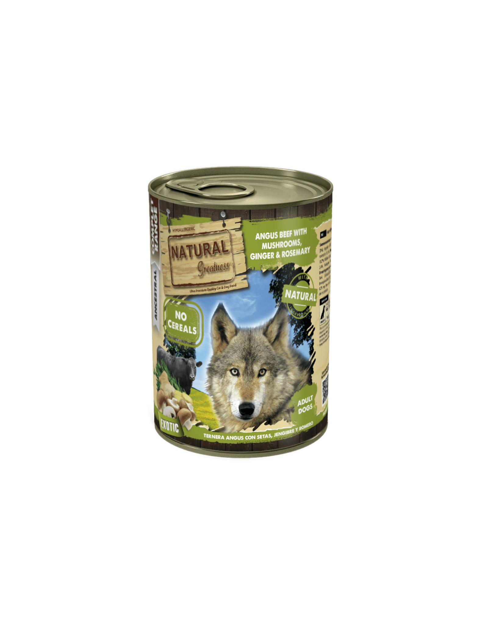 Composición: Carne de vacuno Angus (carne magra, corazón, hígado y pulmones) (65%), Caldo (28,7%), Champiñones (3%), Jengibre (2%), Minerales (1%), Aceite de salmón (0,2%), Romero (0,1%).