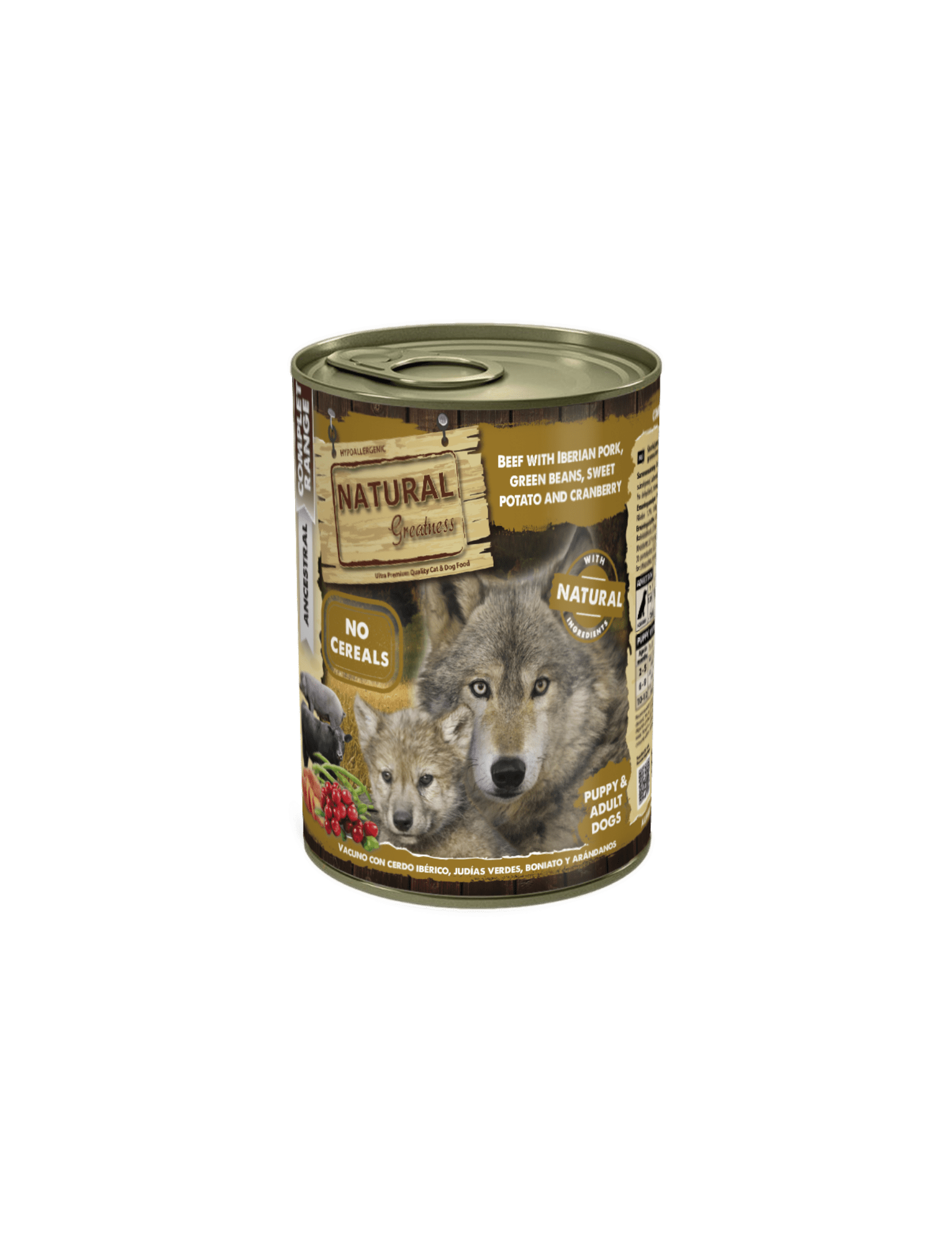 Composición: Carne de Vacuno (26%), Cerdo (carne de cerdo 20%, 4% corazón de cerdo ibérico), Caldo, Aceite de salmón (2%), Judías verdes (2%), Boniato, Sustancias minerales, Arándano rojo. Componentes analíticos: Proteína bruta 6,4%, Fibra bruta 1%, Grasas 8,4%, Ceniza bruta 1,7%, Humedad 79%. Energía metabolizable: 1059 Kcal/kg. Formato: Lata de 400 gramos. Tipo de textura: Carne de vacuno, cerdo y cerdo ibérico triturada con trocitos de judías verdes, boniato y arándanos. |