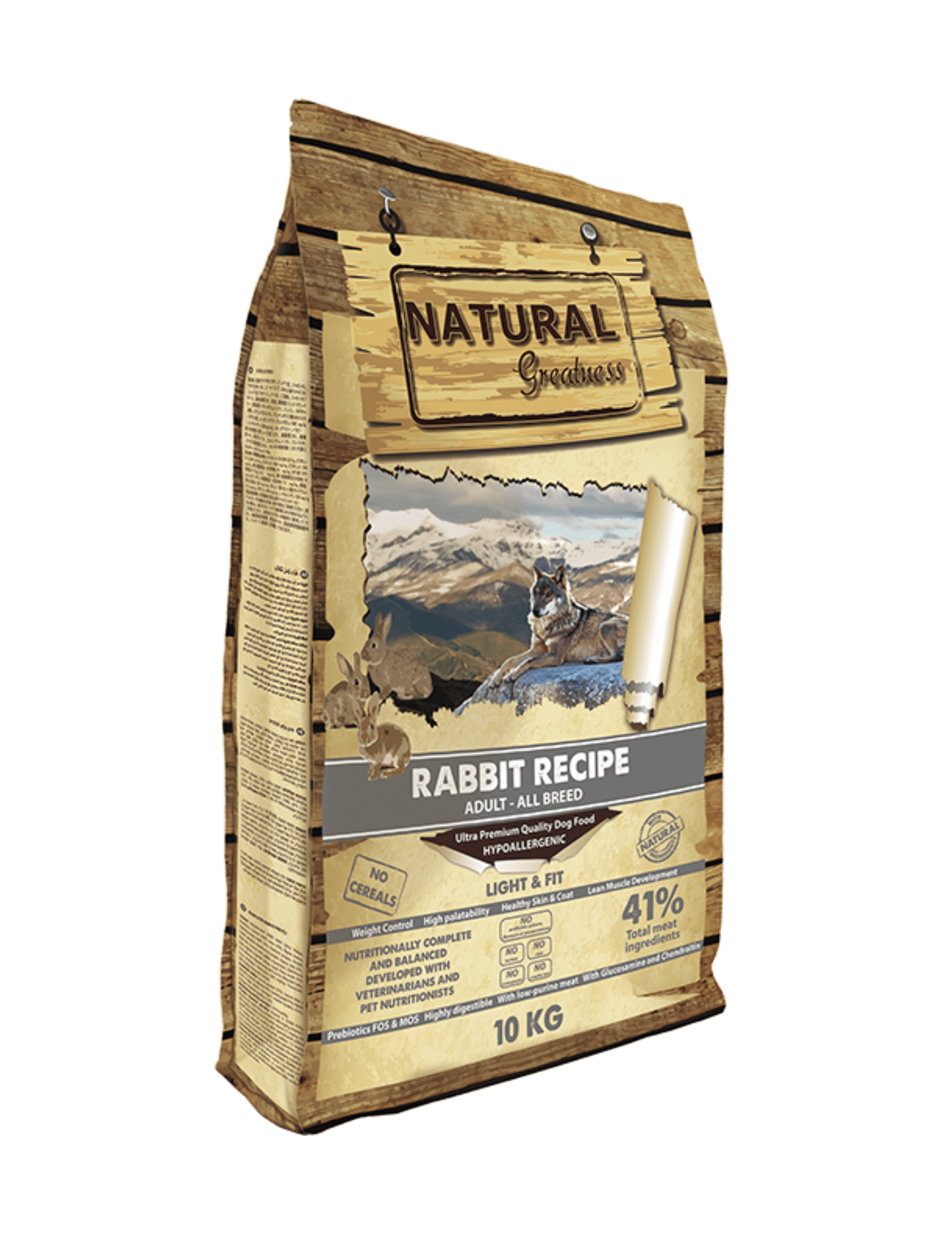 Composición: Carne deshidratada de conejo (26%), Guisantes, Patata, Carne fresca de conejo (10%), Pulpa de remolacha, Hidrolizado de conejo (3%), Proteína de guisante, Levaduras, Semilla de linaza, Proteína de patata, Aceite de pollo (2%), Aceite de pescado, Mix de frutas (manzana y arándanos), Mix de verduras (tomate y espinacas), Zanahoria, Calabaza, Algas, Inulina (FOS 0,1%), Manano-oligosacáridos (MOS 0,1%), Sustancias Minerales, Yucca schidigera, Glucosamina (900 mg/kg), Condroitina (200 mg/kg), Romero, Perejil. Componentes analíticos: Proteína bruta (27%), Aceites y grasas brutas (9%), Ceniza bruta (7%), Fibra bruta (4%), Calcio (1,2%), Fósforo (0,9%), Ácidos grasos omega 3 (0,5%), Ácidos grasos omega 6 (1,2%), L-Carnitina 250 mg/kg. Energía metabolizable: 3.435 kcal/kg. Formatos: 2 kg / 6 kg / 10 kg. |