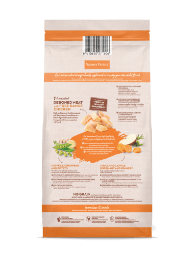 Carne de pollo campero deshuesada* (30%), proteína deshidratada de pollo (21%), guisantes deshidratados* (12%), almidón de guisante*, garbanzos deshidratados* (4%), patata deshidratada* (4%), proteína de patata, proteínas animales hidrolizadas (ave, cerdo, pescado) (3%), grasa avícola* (2,5%), fibra de guisante*, pulpa de remolacha*, sustancias minerales, proteína de guisante*, zanahoria deshidratada* (0,5%, equivalente a un 4% de zanahoria fresca), manzana deshidratada* (0,3%, equivalente a un 2% de manzana fresca), algas marinas deshidratadas (kelp)* (0,01%), romero deshidratado* (0,01%). *Ingredientes naturales