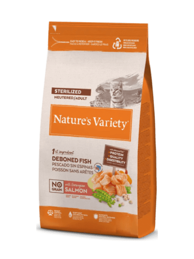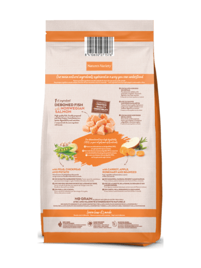 Carne de salmón noruego sin espinas* (30%), guisantes deshidratados* (12%), proteína deshidratada de atún (11%), almidón de guisante*, garbanzos deshidratados* (6%), proteína de patata, proteína de guisante*, proteína deshidratada de salmón (5%), patata deshidratada* (4%), proteínas animales hidrolizadas (ave, cerdo, pescado) (3%), grasa avícola* (2%), fibra de guisante*, polvo de celulosa, pulpa de remolacha*, zanahoria deshidratada* (0,5%, equivalente a un 4% de zanahoria fresca), sustancias minerales, manzana deshidratada* (0,3%, equivalente a un 2% de manzana fresca), algas marinas deshidratadas (kelp)* (0,01%), romero deshidratado* (0,01%). *Ingredientes naturales
