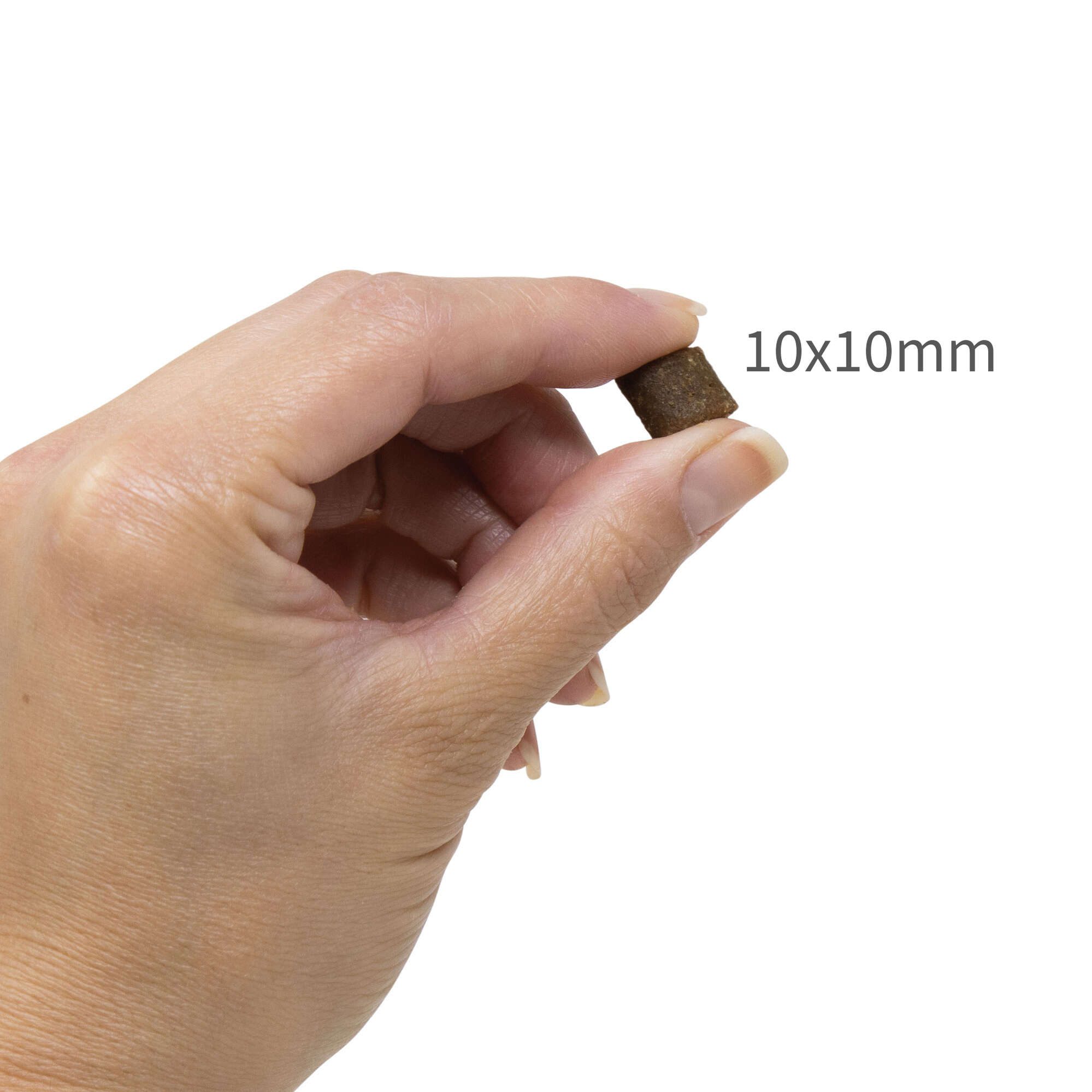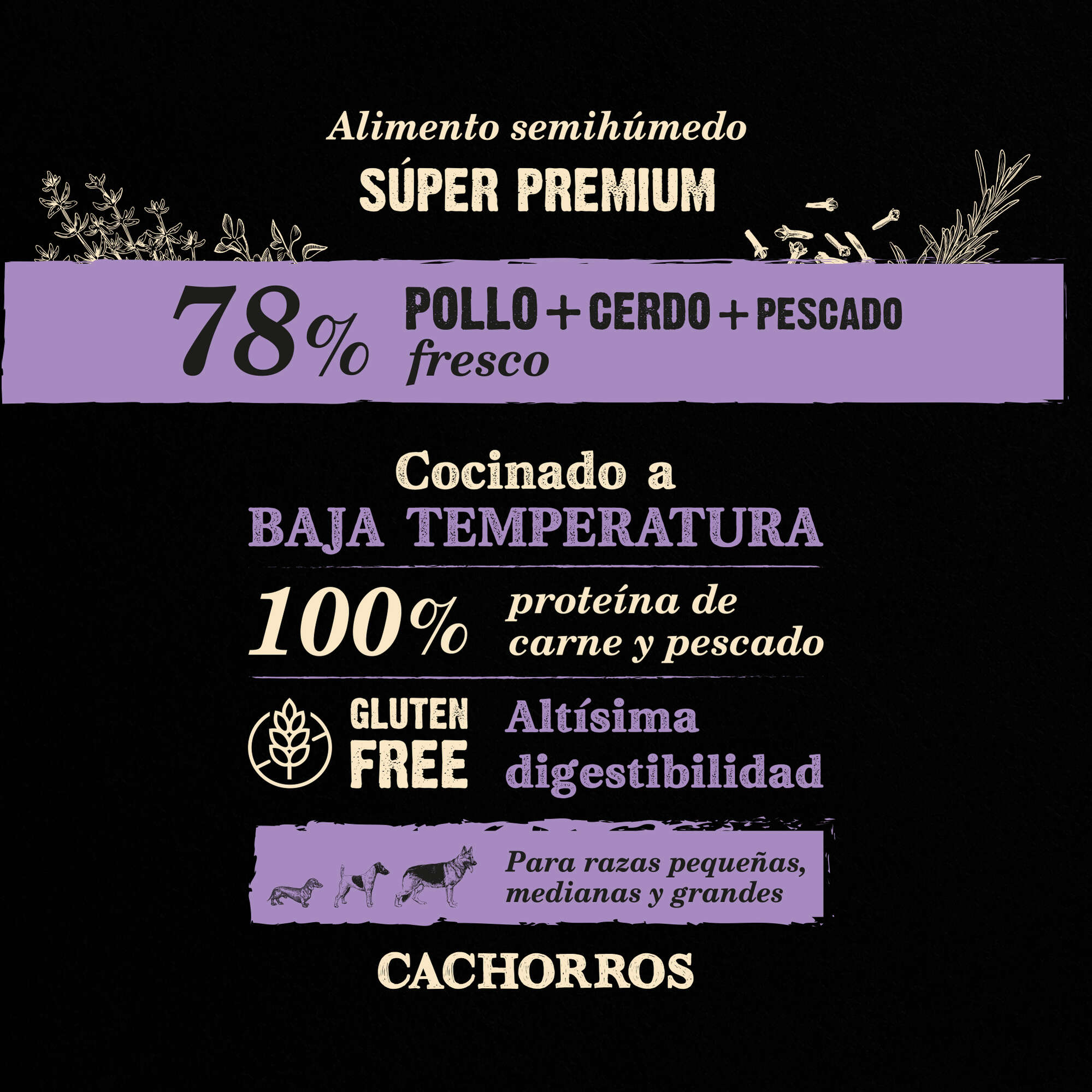 Composición: 30% pollo fresco, 26% cerdo fresco, 22% pescado fresco (alacha (Sardinella aurita), caballa (Scomber scombrus), jurel (Trachurus spp.), sardina (Sardina pilchardus)), almidón hidrolizado, tocoferoles de aceites vegetales, extracto de romero, huevo deshidratado, aceite esencial de orégano, tomillo, clavo, romero, canela Ceylán. ADITIVOS/kg: Vitamina A (3a672a): 22.726 UI, vitamina D3 (3a671): 1.450 UI, vitamina E (3a700): 454 UI, zinc (3b603): 100 mg, hierro (3b103): 72 mg, manganeso (3b503): 36 mg, cobre (3b405): 7,2 mg, yodo (3b201): 1,27 mg.