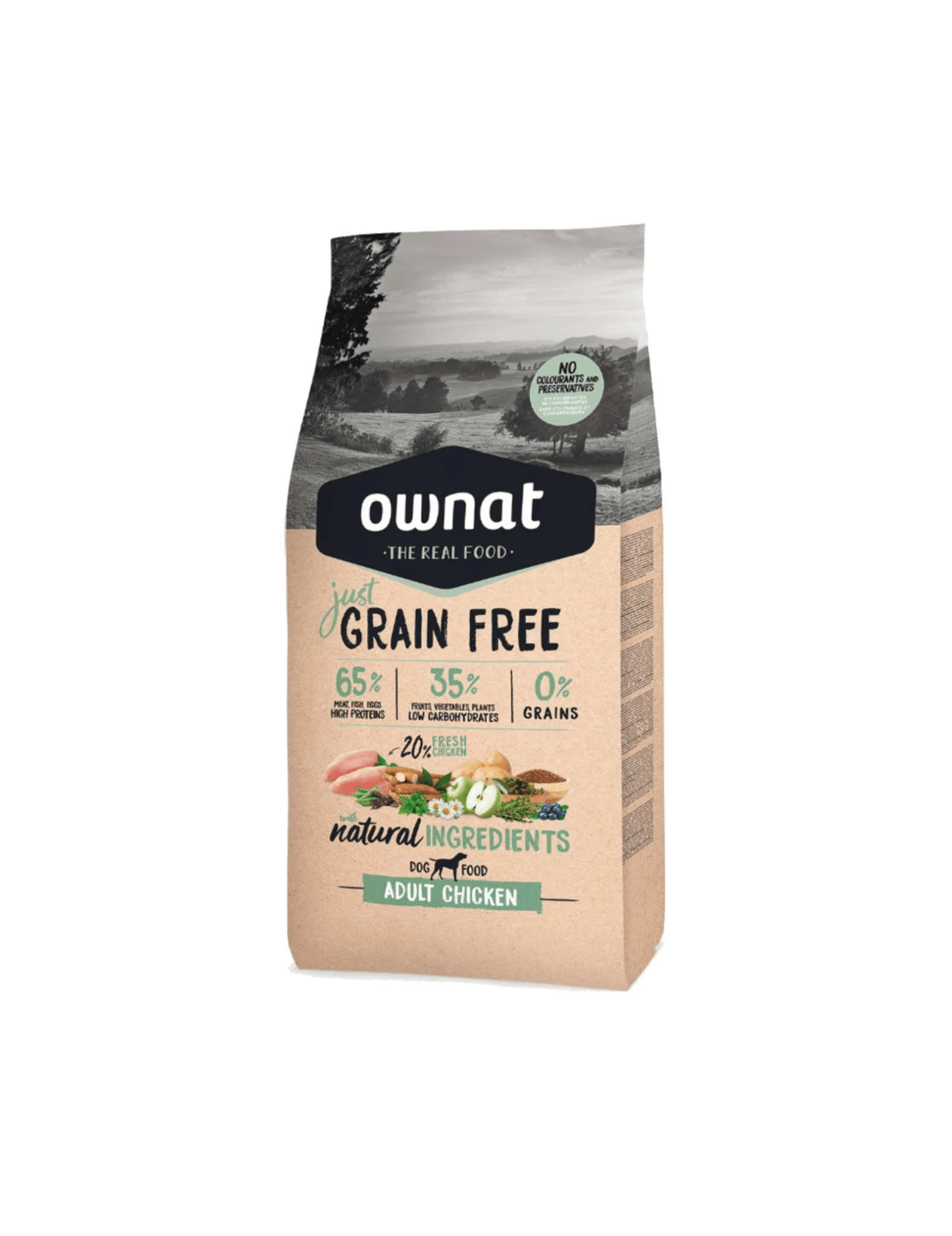 Pollo deshidratado (30%), pollo fresco* (mín. 20% antes de la extrusión), guisantes enteros* (14%), grasa avícola (preservada con antioxidantes naturales), raíces de mandioca* (6%), patata deshidratada* (5%), vaina de algarroba* (5%), cerdo deshidratado (4%), proteína hidrolizada de pollo, pescado deshidratado, levadura de cerveza* (1%), pulpa de remolacha, manzana* (1%), semilla de lino* (1%), sal gema*, aceite de salmón (preservado con antioxidantes naturales), fructo y manano oligosacáridos, alfalfa deshidratada*, algas marinas deshidratadas* (500 mg/kg), glucosamina (500 mg/kg), yucca schidigera, condroitín sulfato (100 mg/kg), arándanos* (100 mg/kg), tomillo* (80 mg/kg), flor de manzanilla* (80 mg/kg), hinojo* (80 mg/kg), equinácea* (80 mg/kg), té verde* (80 mg/kg).*INGREDIENTES NATURALES