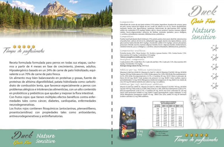 Hidrolizado de carnes de ave (70%) (pato 21%) patata, legumbres, levadura de cerveza,grasa de pato, aroma natural de higado de ave, aceite de salmón rico en Omega3, huevo deshidratado, manzana, berriers mix (arándanos, fresas, frambuesas y moras), lignocelulosa, zanahoria, hidroclorato de glucosamina, sulfato de condroitina, fosfato cálcico, cloruro potásico, taurina, manano – oligosacáridos, fructo – oligosacáridos, extractos de hierbas, minerales quelados, yucca shidigera, L- carnitina, antioxidantes naturales, bifidobacterias, prebióticos.