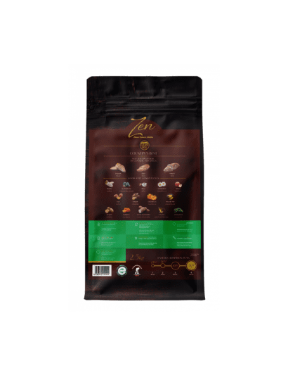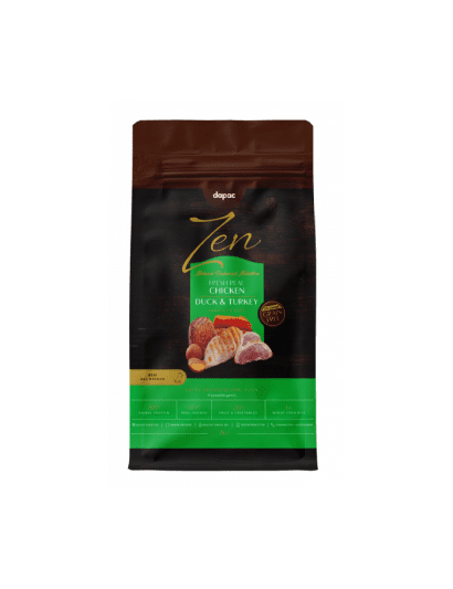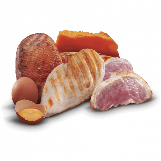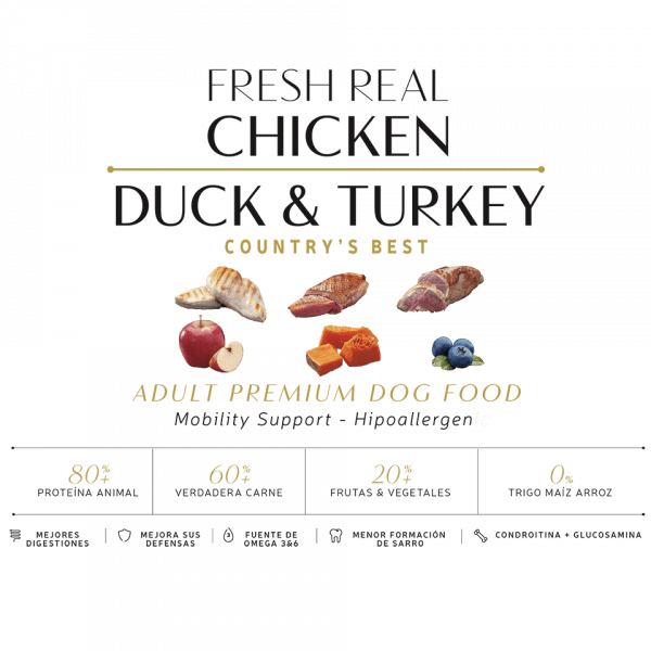 Pollo fresco (34%). Pollo, pavo y pato deshidratado (22%). Patata (18%). Guisantes (10%). Grasa de ave (6%). Manzana (4%). Hígado deave. Huevos enteros (2%). Levaduras. Minerales. Calabaza (1%). Aceite de pescado. Krill. Arándanos. Jengibre. Inulina (fuentede FOS). Manano-oligosacáridos (MOS). Manzanilla. Hinojo. Caléndula. Glucosamina. Yucca schidigera. Sulfato de condroitina.
